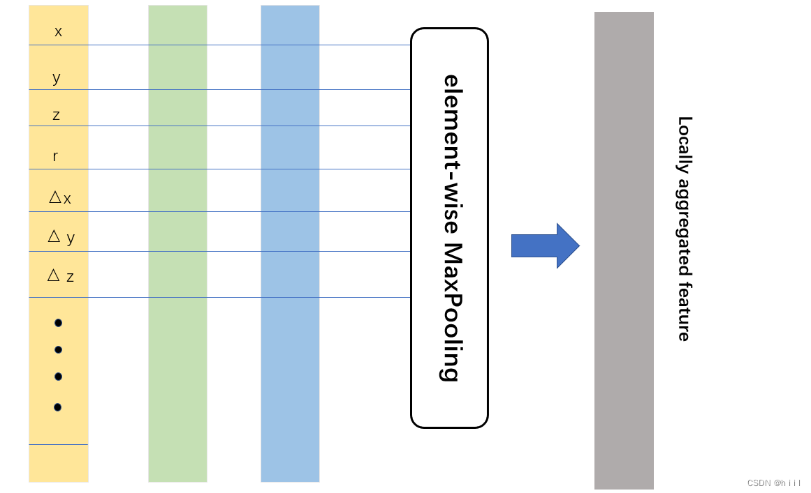 然后对一个体素中的所有点,在相同维度上用最大池化得到的一组特征就是可以用来表征该voxel的特征了,比如该体素的表面形状信息等。相当于在一个voxel中用了一次PointNet,把提取出的特征作为该voxel的局部特征locally aggregated feature(LAF)。