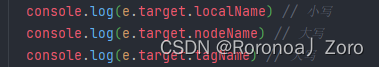 前端获取点击的元素名 event.target.localName获取的是小写的元素名。event.target.localName获取的是大写的元素名。例如点击的是一个button,那么就会该值就为"button"例如点击的是一个button,那么就会该值就为"BUTTON"例如点击的是一个button,那么就会该值就为"BUTTON"event.target.tagName获取的是大写的元素名。