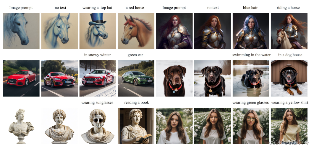 近年来,大型文本到图像扩散模型展现了强大的生成能力,创造出高保真图像,但生成所需的文本提示往往复杂且工程量大。为了解决这一问题,文本提示的替代方法之一是使用图像提示,因为图像胜过千言万语。现有的直接微调预训练模型的方法虽然有效,但需要大量计算资源,且不兼容其他基础模型、文本提示和结构控制。本文提出了IP适配器,一个有效且轻量级的适配器,用于实现文本到图像扩散模型的图像提示能力。IP适配器的关键设计是解耦的交叉注意机制,可分离文本特征和图像特征的交叉注意层。尽管方法简单,IP适配器仅使用22M参数就能达到甚至超越完全微调的图像提示模型的性能水平。当冻结预训练的扩散模型时,提出的IP适配器不仅可应用于其他自定义模型的微调,还可与现有可控工具结合实现可控生成。通过解耦的交叉注意策略,图像提示可以很好地与文本提示结合,实现多模态图像生成。