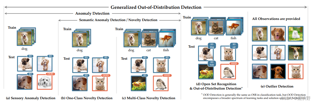 异常检测(Anomaly Detection,AD)、新类检测(Novelty Detection)、开集识别(Open Set Recognition,OSR)、离群检测(Outlier Detection,OD)都可以视为分布检测的特例或子任务