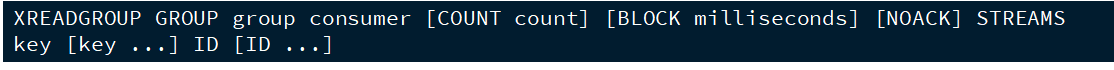 //从消息队列中读取消息 XREADGROUP GROUP g1 c1 COUNT 1 BLOCK 2000 STREAMS stream.orders >