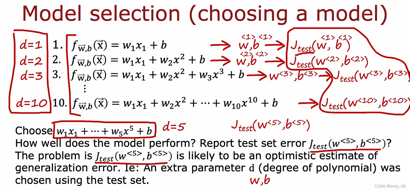 原因:此处通过不同的d也就是不同个数的w来寻找最小的Jtest来拟合模型,从本质上和前面的方法一样,因为数据集是无穷的,在我们给定的有限数据之外还有更多的数据。
