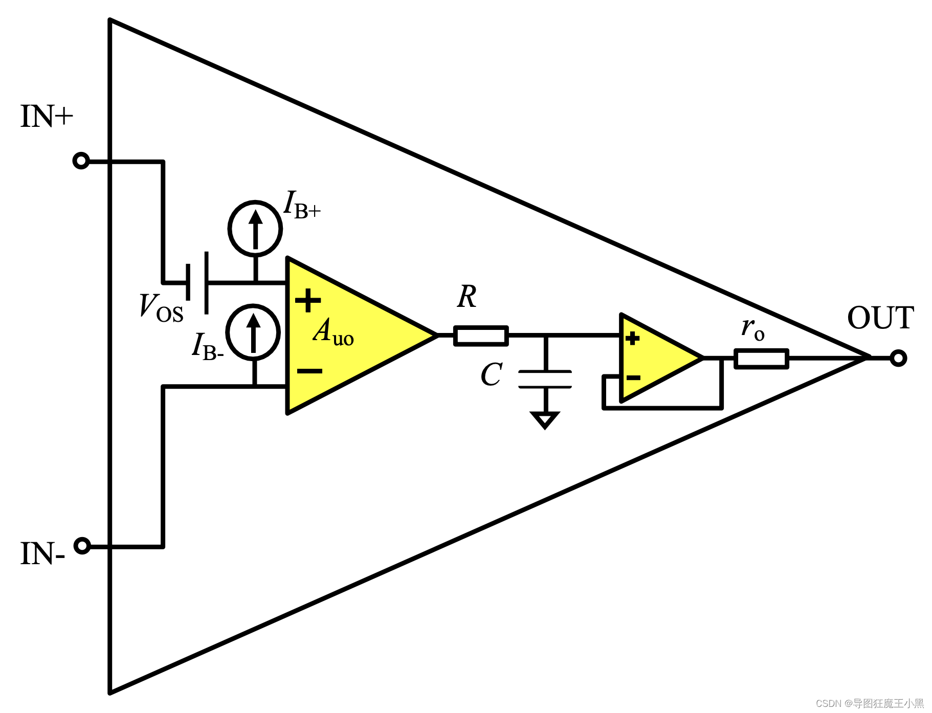 运算放大器 这就是闭环增益,因为20kΩ的反馈电阻将输出端与输入端形成一闭合回路,当。若输人加到同相端则输出与输入同相,若输入加到反相端则输出与输入反相。作为有源器件,运算放大器需要电压源为其供电。运算放第大器将两输人端口之间的差分电压。= 3.9999398V,即得。运算放大器的等效电路模型如图。:反相输入端与地之间的电压。:同相输入端与地之间的电压。乘以增益A得到输出电压Vo。