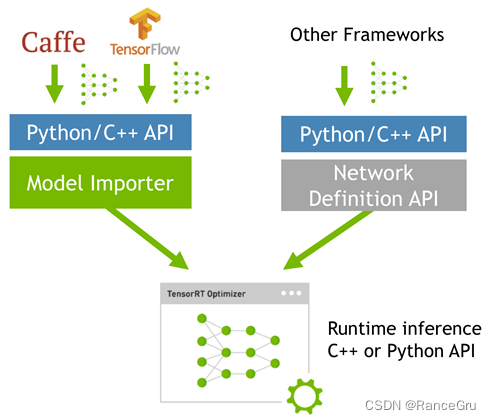 视觉学习笔记11——TensorRT安装配置及使用 一般的深度学习项目,训练时为了加快速度,会使用多 GPU 分布式训练。但在部署推理时,为了降低成本,往往使用单个 GPU 机器甚至嵌入式平台(比如 NVIDIA Jetson)进行部署,部署端也要有与训练时相同的深度学习环境,如 caffe,TensorFlow 等。由于训练的网络模型可能会很大(比如,inception,resnet 等),参数很多,而且部署端的机器性能存在差异,就会导致推理速度慢,延迟高。这对于那些高实时性的应用场合是致命的,比如自动驾驶要求实时目标检测,目标追踪等。