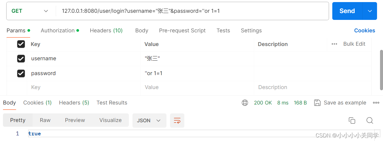 现在我们即使不输正确的密码也可以登录!!!!下图中可以看到,后端返回的结果是true!