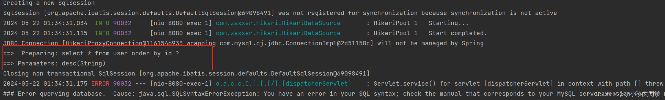 3.在某些特殊场合下只能用${},不能用#{}。例如:在使用排序时ORDER BY ${id},如果使用#{id},则会被解析成ORDER BY “id”,这显然是一种错误的写法。这也对应了第二点的说法,排序功能, 表名, 字段名作为参数时, 这些情况需要使⽤${}