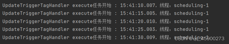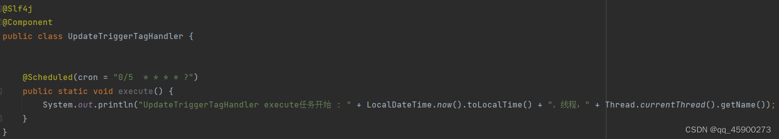 一、第一种使用方式,创建一个自定义类,写入自定义方法(非静态方法也可以),加上注解@Scheduled(cron="0/5 * * * * ?"),内部为cron表达式,详情请百度: