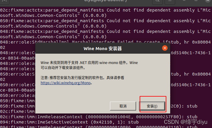 运行winecfg命令,该命令将安装Mono和Gecko并设置wine环境