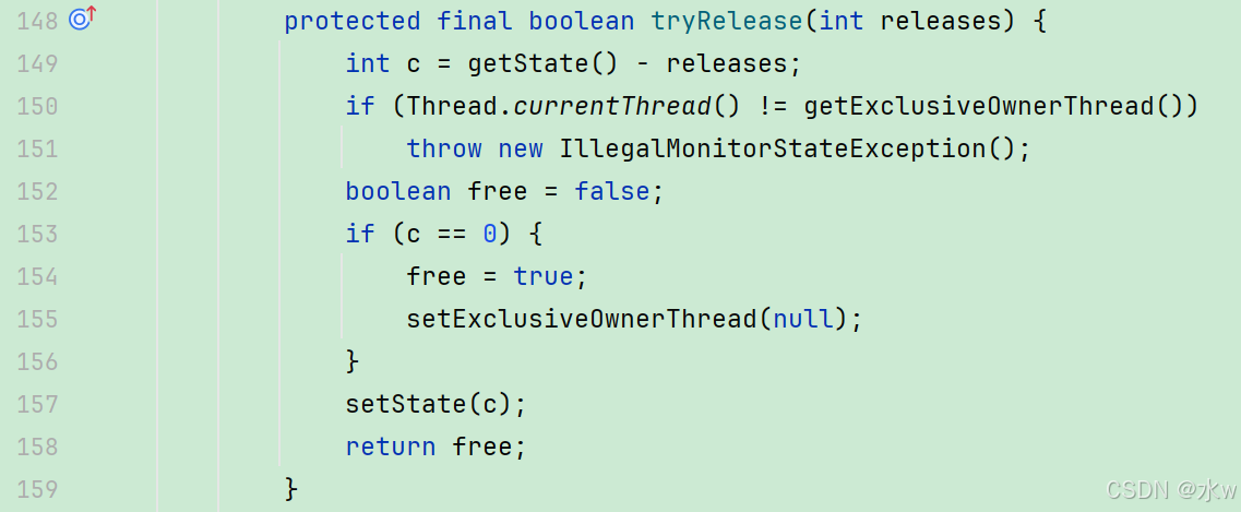 因为上面AQS的锁获得线程为线程A ,所以现在只有线程A 可以进行释放锁,当线程A 调用ReentrantLock .unlock() 时,最终执行ReentrantLock.tryRelease()方法,代码如下: