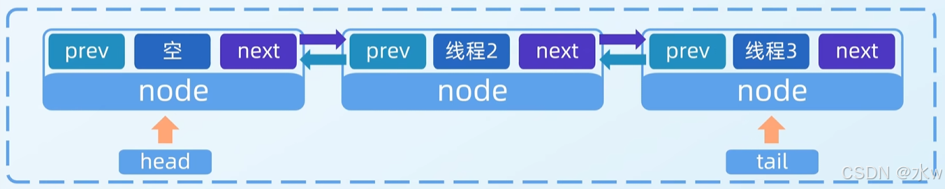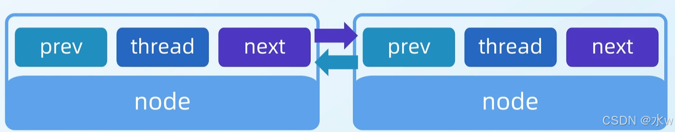 由 Node节点组成的双向链表,Node节点保存了等待线程的相关信息。Node节点主要包括三个属性:前序节点pre,线程thread,后序节点next。所以Node是双向的节点。