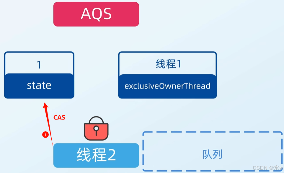 接着第二个线程(线程2)来了,也要执行加锁操作。同样也是先执行CAS操作要把AQS中的state变量修改为1,但因为线程1已经把AQS中的state变量修改为1了,表示此时已经有线程获得了AQS的锁,所以线程2修改是失败的。这时,就要把线程2放入队列中了。