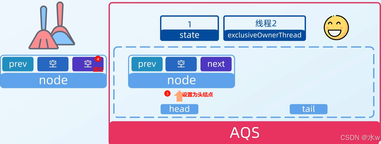 - 接着,线程2节点把自己修改成头结点,并且把头节点中的线程变量置为空。而且,还要把原来头节点中的后序节点设置为空,这样垃圾回收时就直接能回收掉了。