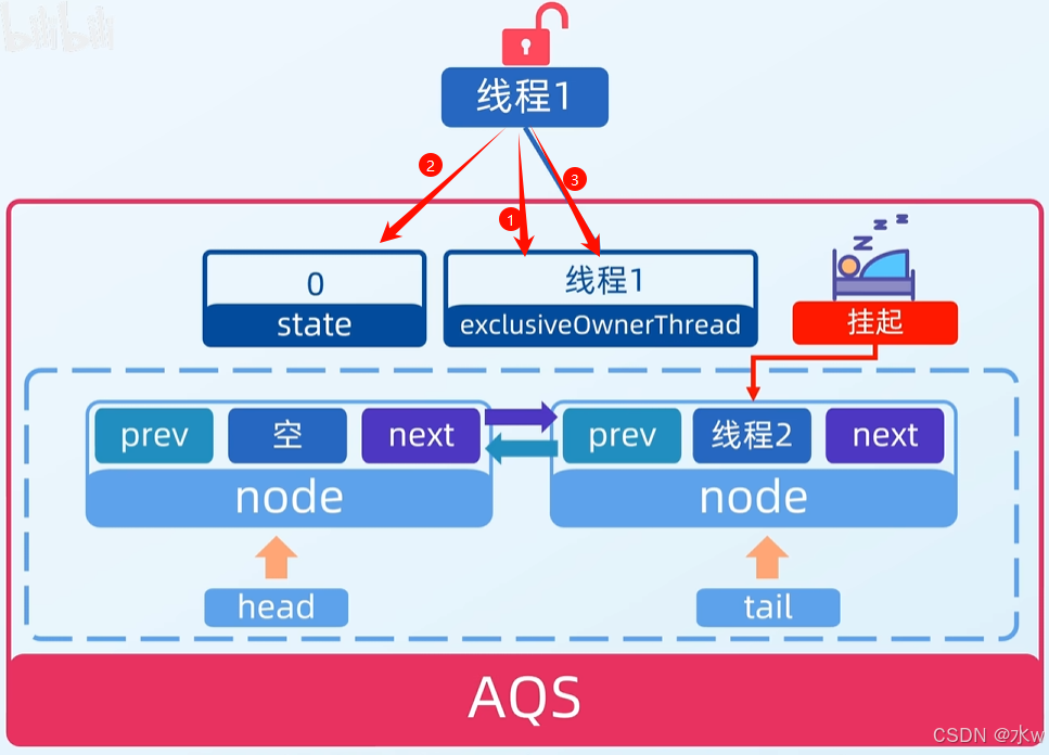 state 默认为0,表示锁处于未锁定状态。当state=1时,则代表当前对象锁已经被占有,其他线程来加锁时会失败,加锁失败的线程会被放入上面提到的那个双向链表队列中。