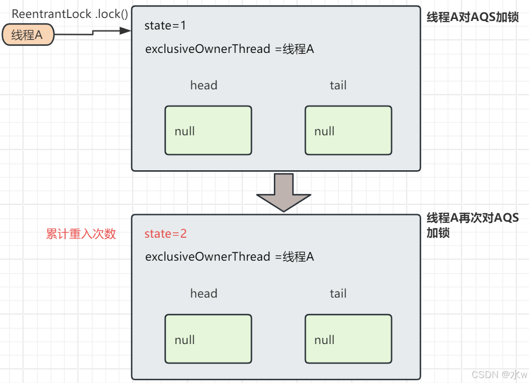 - 如果是同一个线程的话,获取到当前AQS的state变量,执行state+1累计重入次数。