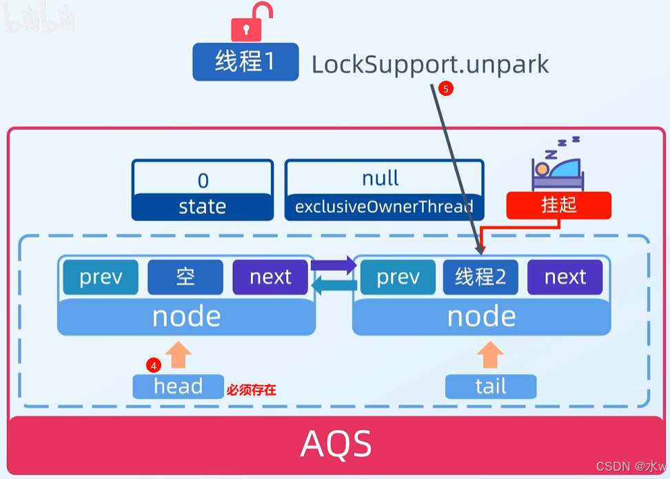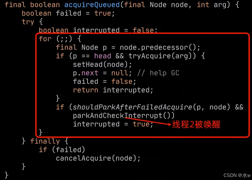 此时,头结点的后序第一个节点就是线程2节点,所以线程2就被唤醒了。因为之前线程2是在一个死循环里被挂起的, 所以被唤醒之后会接着执行循环中的流程。