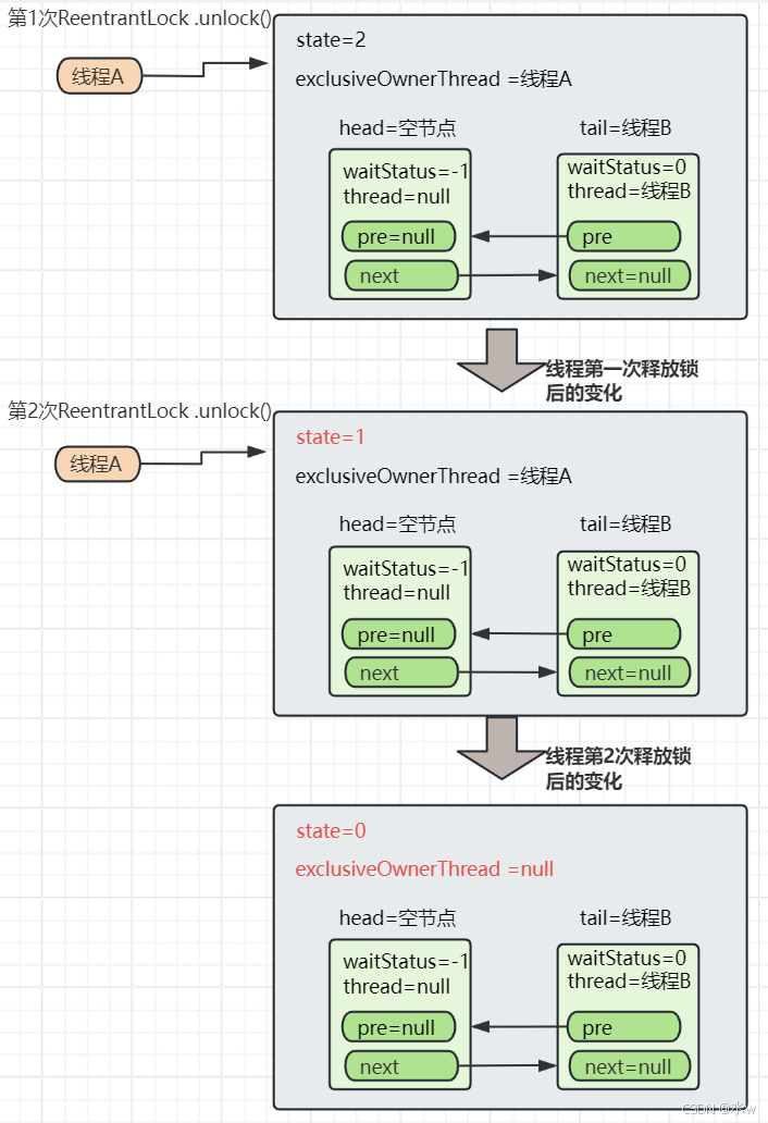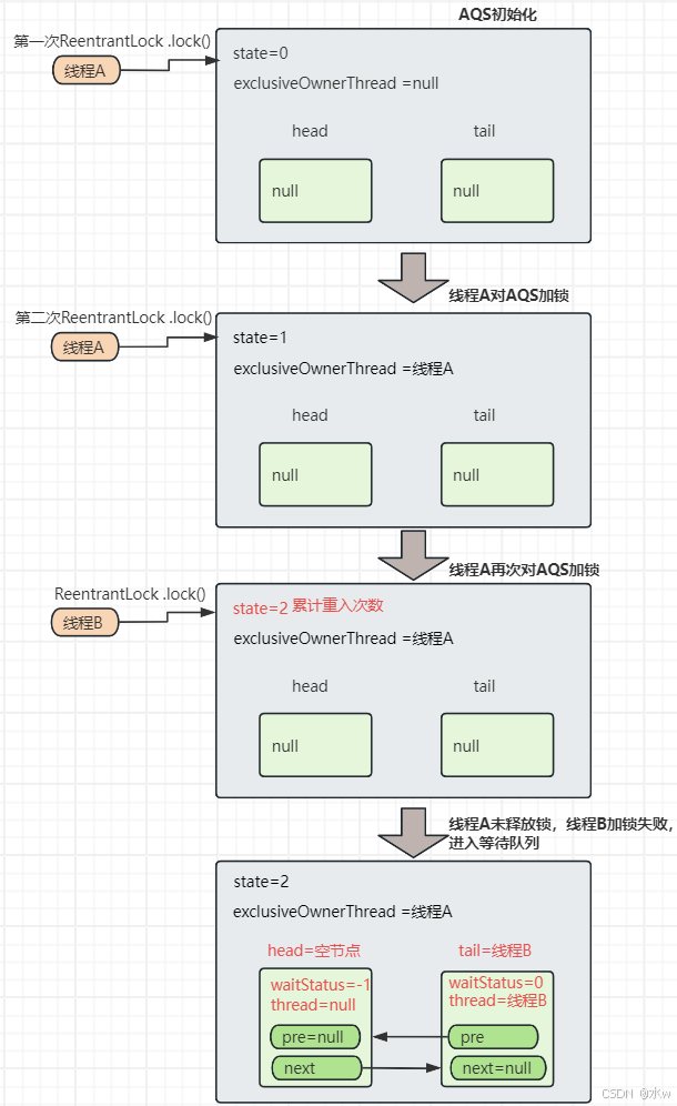 最后整个AQS初始化、线程A两次加锁、线程B加锁的流程,如下图所示: