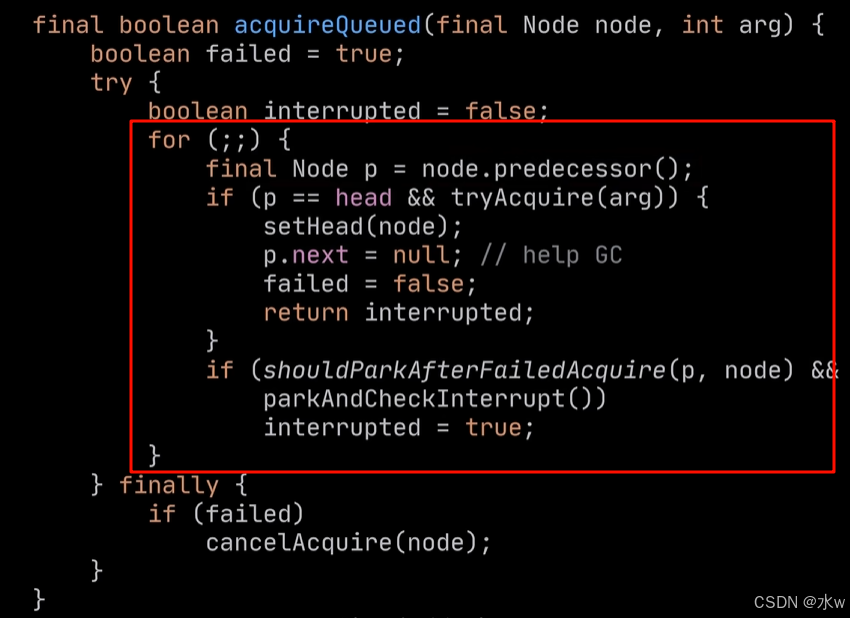 - 首先,先获取前序节点,判断前序节点是否为头结点,此时确实是头结点。这么判断是为了保证只有头结点的后序第一个节点才有资格来获取锁。
