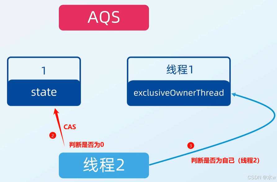 但是,此时线程2还没死心还想再尝试一下,这时线程2会再执行CAS操作获取一次AQS中的state变量,判断是否为0,很明显依然不是0。接着,再判断AQS中表示获得锁的线程变量exclusiveOwnerThread是不是线程2自己,表示已经有线程获得了AQS的锁,还没进行释放,此时获得锁的线程和当前线程不是同一个,这步是为了实现可重入锁的功能。