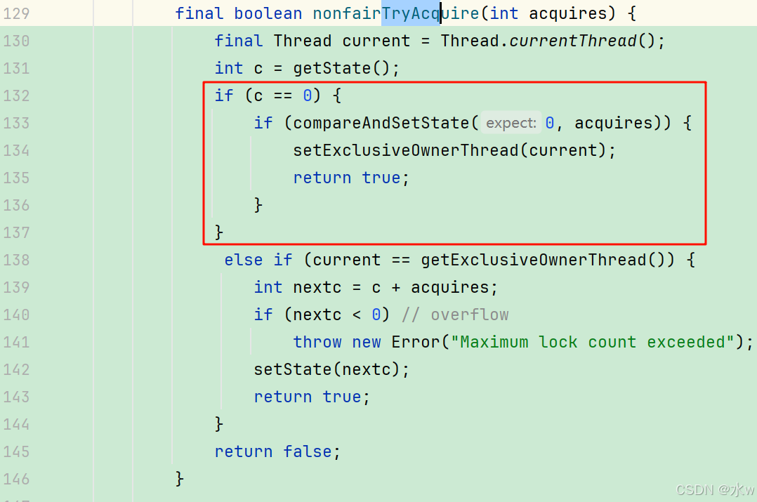 - 首先拿当前线程和已经获得AQS锁的线程对比是否是同一个线程。