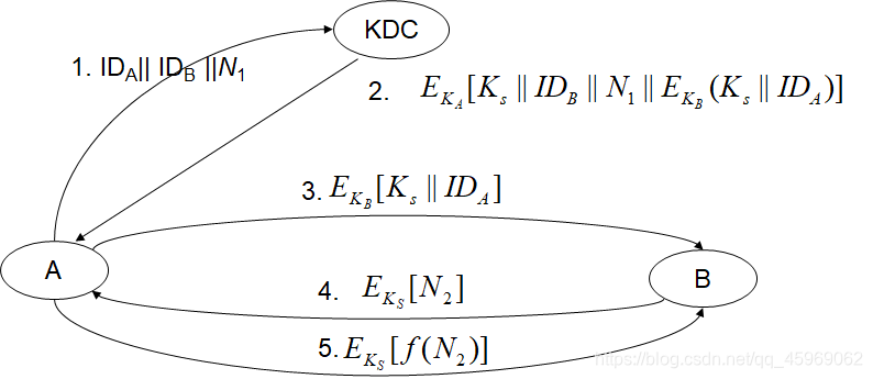 A → K D C : I D A ∣ ∣ I D B K D C → A : E S K A U [ I D B ∣ ∣ P K B ] A → B : E P K B [ N A ∣ ∣ I D A ] B → K D C : I D B ∣ ∣ I D A ∣ ∣ E P K A U [ N A ] K D C → B : E S K A U [ I D A ∣ ∣ P K A ] ∣ ∣ E P K B [ E S K A U [ N A ∣ ∣ K S ∣ ∣ I D B ] ] B → A : E P K A [ E S K A U [ N A ∣ ∣ K S ∣ ∣ I D B ] ∣ ∣ N B ] A → B : E K S [ N B ] A\rightarrow KDC:\ ID_A||ID_B\\ KDC\rightarrow A:\ E_{SK_{AU}}[ID_B||PK_B]\\ A\rightarrow B:\ E_{PK_B}[N_A||ID_A]\\ B\rightarrow KDC:ID_B||ID_A||E_{PK_{AU}[N_A]}\\ KDC\rightarrow B:E_{SK_{AU}}[ID_A||PK_A]||E_{PK_B}[E_{SK_{AU}}[N_A||K_S||ID_B]]\\ B\rightarrow A:E_{PK_A}[E_{SK_{AU}}[N_A||K_S||ID_B]||N_B]\\ A\rightarrow B:E_{KS}[N_B] A→KDC: IDA∣∣IDBKDC→A: ESKAU[IDB∣∣PKB]A→B: EPKB[NA∣∣IDA]B→KDC:IDB∣∣IDA∣∣EPKAU[NA]KDC→B:ESKAU[IDA∣∣PKA]∣∣EPKB[ESKAU[NA∣∣KS∣∣IDB]]B→A:EPKA[ESKAU[NA∣∣KS∣∣IDB]∣∣NB]A→B:EKS[NB]
