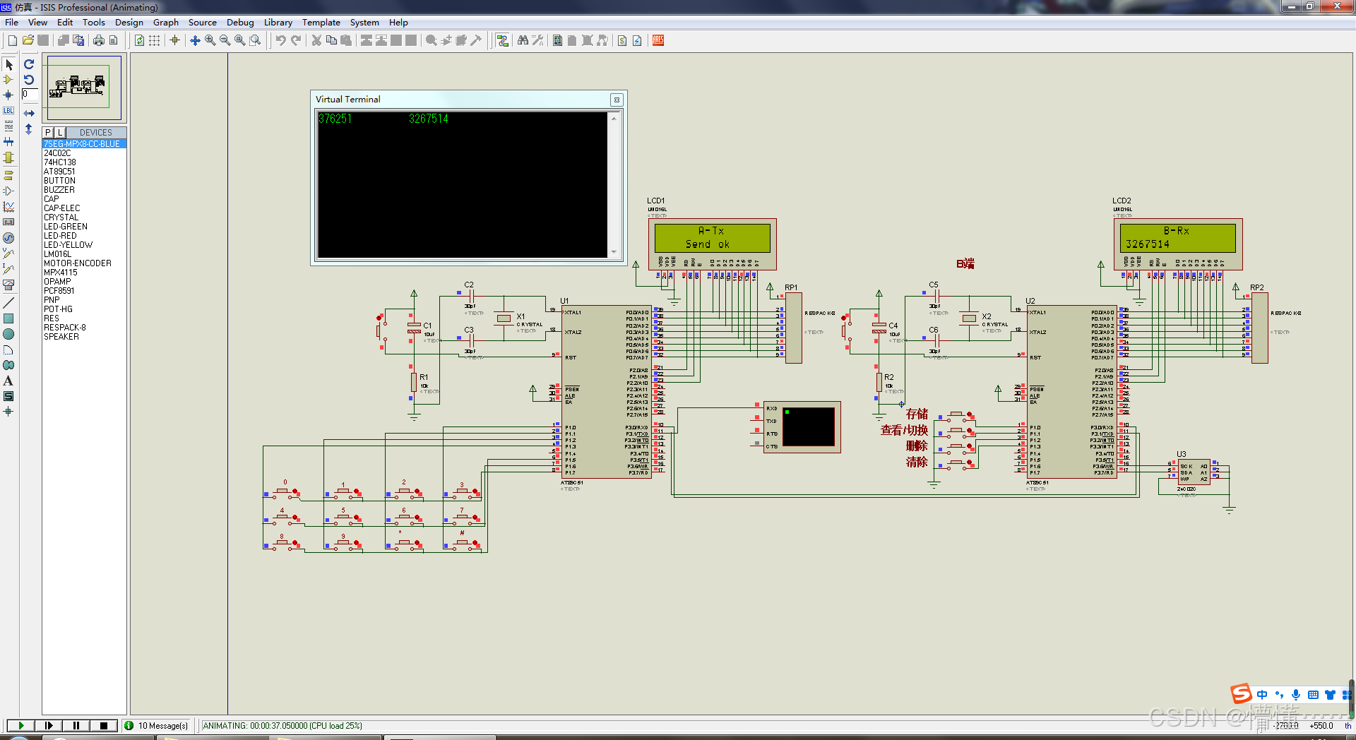 B端通过实时监测串口的接收数据,若数据校验满足要求则显示在LCD屏上,若不满足丢掉接收数据且清空LCD屏;按键1用于将接收的数字串存入AT24C02,并显示在LCD屏上,如界面3,数据校验要求最后一个数为前面所有位数字和的个位数。