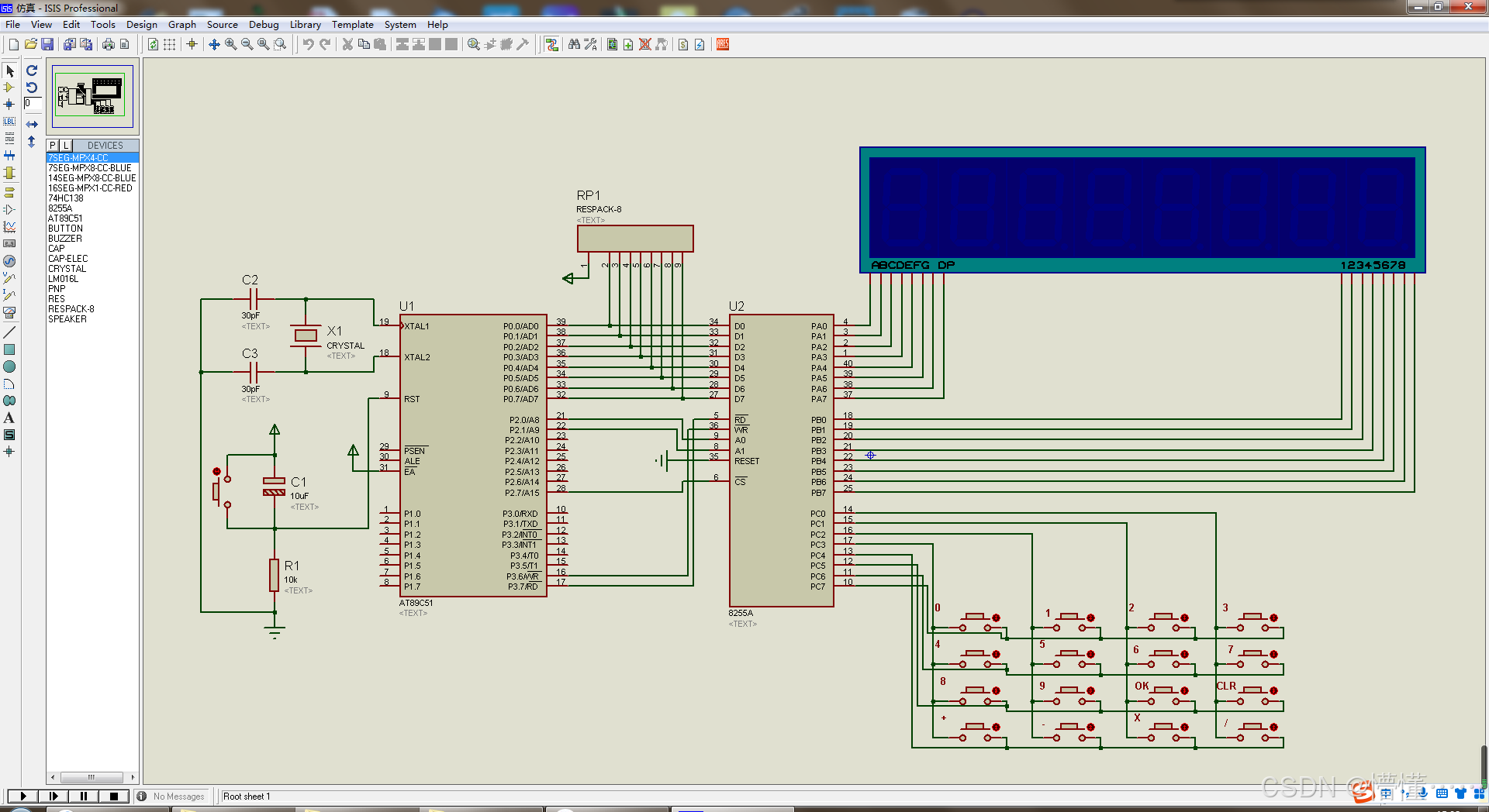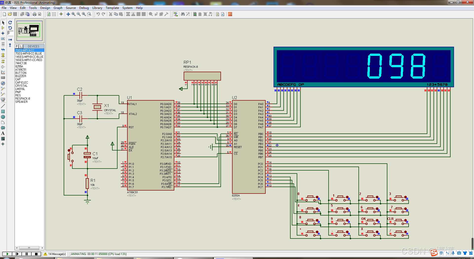 毕设帮助、开题指导、技术解答(有偿)见文末。 目录 一、设计功能 二、proteus仿真 三、原理图 四、程序源码 五、资料包括 一、设计功能 1、能实现三位数的加减乘除。 2、键盘输入计算数据,数码管显示输入值 3、使用8255扩展接线驱动数码管和键盘 二、proteus仿真 三、原理图 四、程序源码 五、资料包括 需要完整的资料可以点击下面的名片,找我要资源压缩包的百度网盘下载地址及提取码。