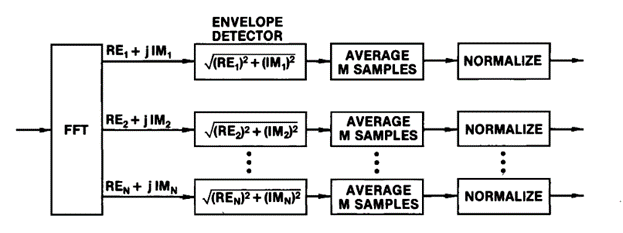 包络检波器输入端的噪声为零均值,高斯分布,但在每个bin中有不同的方差。方差的选择使得包络检测器输出的噪声谱是线性倾斜的,斜率是任意选择的。因此,包络检波器的输出为Rayleigh分布,在每个bin中具有不同的均值和方差。