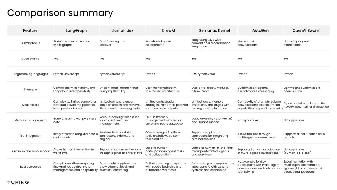 AI 代理框架的格局多种多样,每个框架都具备独特的优势并能满足特定需求。LangGraph 擅长处理复杂的状态工作流,而 LlamaIndex 则专注于高效的数据索引和检索。CrewAI 简化了基于角色的协作式代理系统的开发,而 Microsoft Semantic Kernel 则提供了将 LLM 与传统编程语言集成的强大解决方案。Microsoft AutoGen 促进了基于多代理对话的下一代 LLM 应用程序的创建,而 OpenAI Swarm 则提供了一个用于试验多代理协调的轻量级框架。