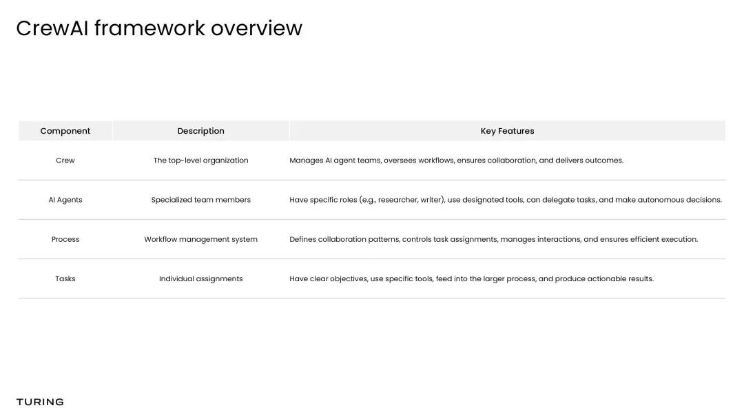 CrewAI 框架由几个关键组件[23]组成,它们共同协调代理协作: