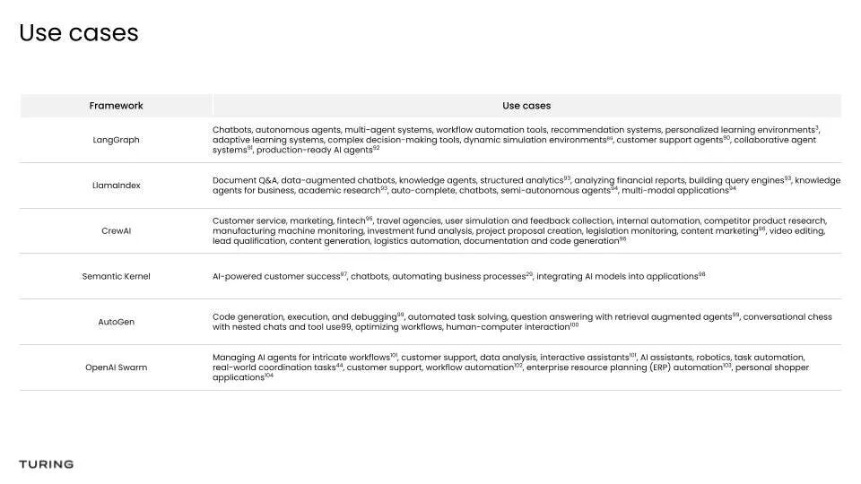AI 代理框架在各个领域都有着广泛的潜在应用。以下是每个框架的一些值得注意的用例: