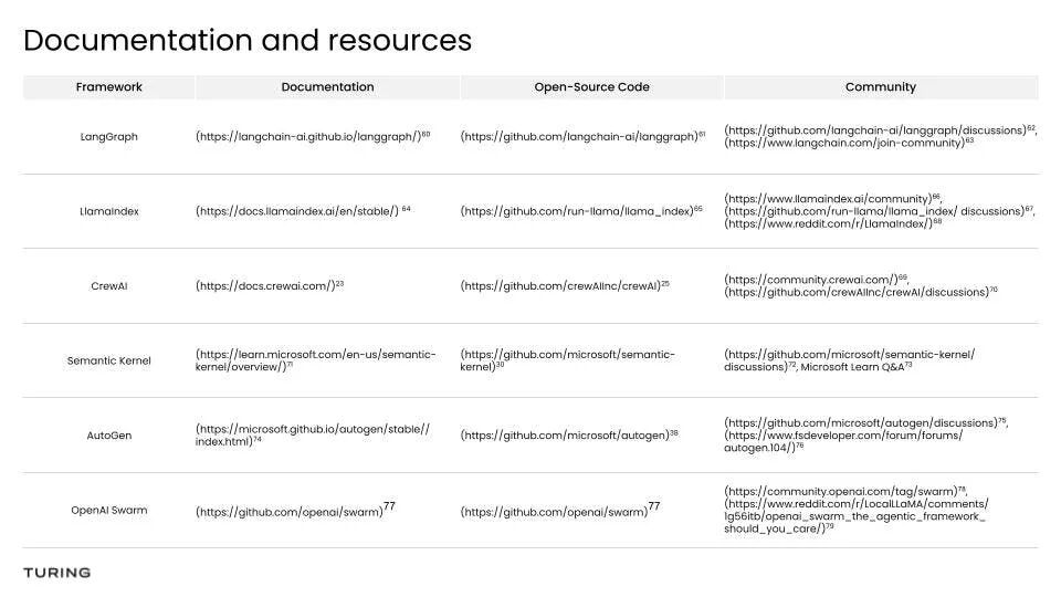 对于使用 AI 代理框架的开发者来说,获取全面的文档和社区支持至关重要。以下是每个框架可用资源的摘要:
