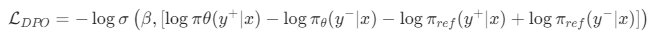 简单理解就是让模型在参考模型基础上,倾向生成被人类偏好的回答 ( y^+ ),同时降低生成不被偏好的回答 ( y^- ) 的概率。