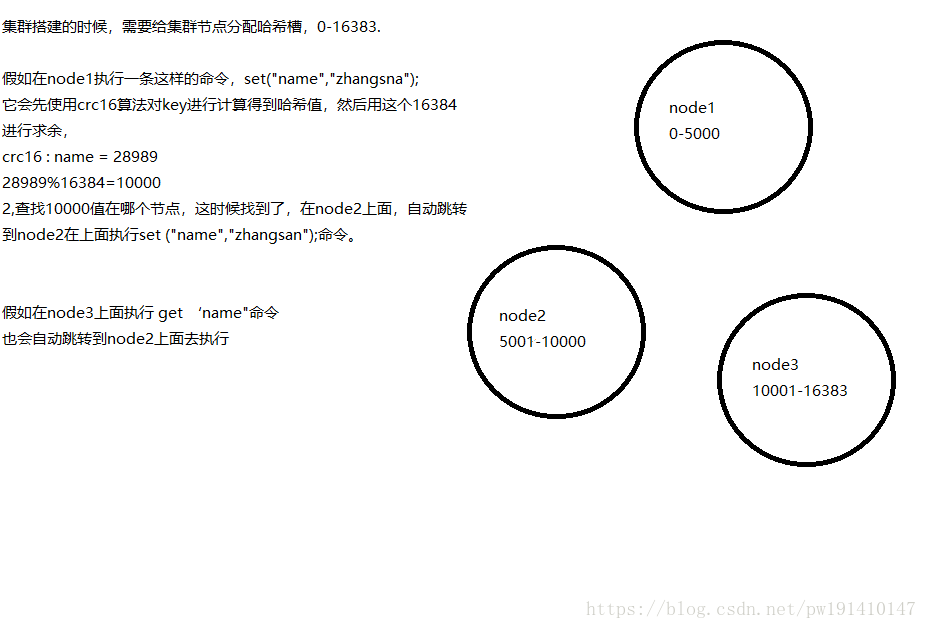 在redis的每一个节点上,都有这么两个东西,一个是插槽(slot)可以理解为是一个可以存储两个数值的一个变量这个变量的取值范围是:0-16383。还有一个就是cluster我个人把这个cluster理解为是一个集群管理的插件。当我们的存取的key到达的时候,redis会根据crc16的算法得出一个结果,然后把结果对 16384 求余数,这样每个 key 都会对应一个编号在 0-16383 之间的哈希槽,通过这个值,去找到对应的插槽所对应的节点,然后直接自动跳转到这个对应的节点上进行存取操作。