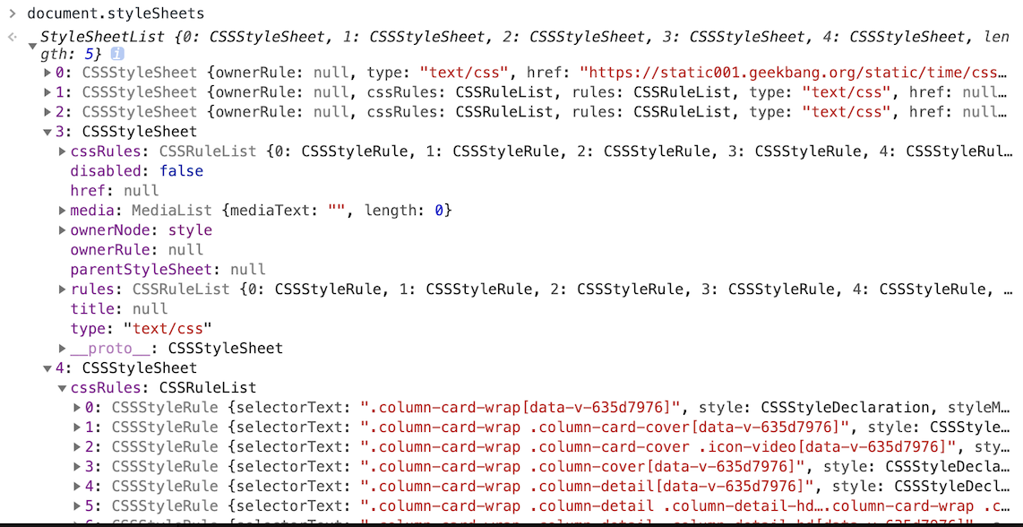 为了加深理解,你可以在Chrome控制台中查看其结构,只需要在控制台中输入document.styleSheets,然后就看到如下图所示的结构: