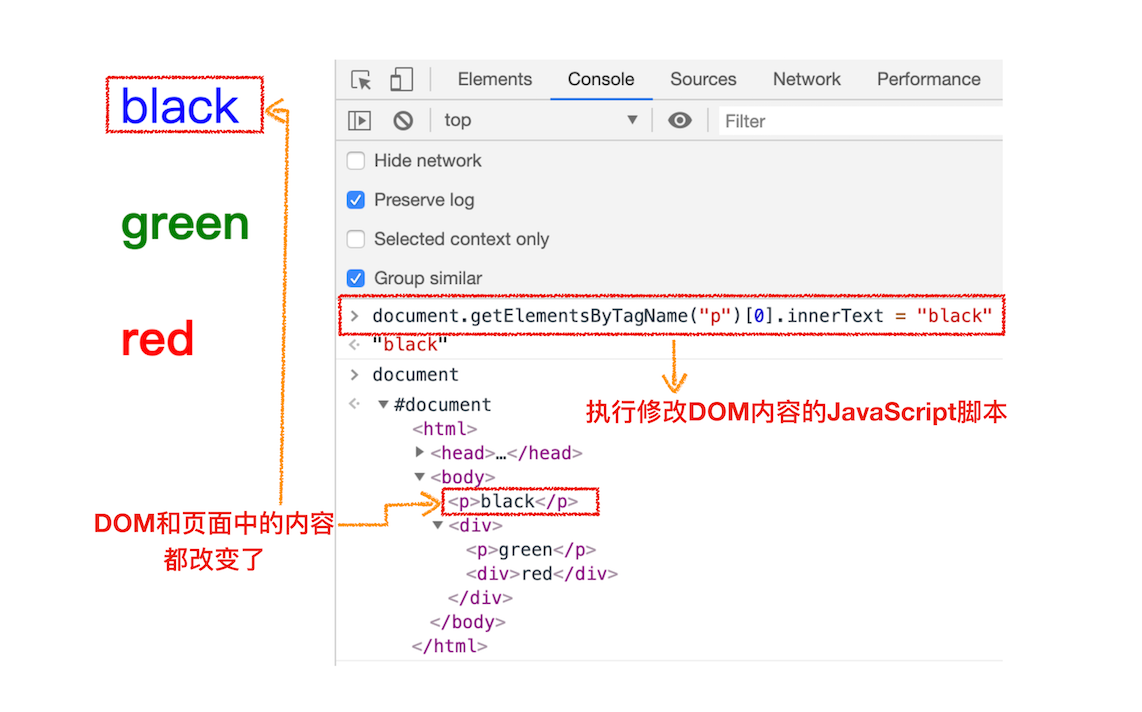 这行代码的作用是把第一个<p>标签的内容修改为black,具体执行结果你可以参考下图: