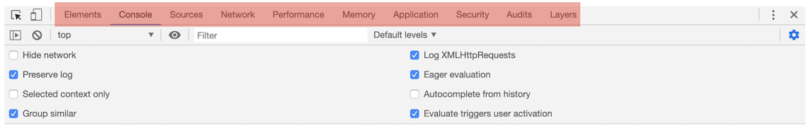 从图中可以看出,它一共包含了10个功能面板,包括了Elements、Console、Sources、NetWork、Performance、Memory、Application、Security、Audits和Layers。