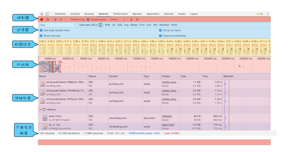 网络面板由控制器、过滤器、抓图信息、时间线、详细列表和下载信息概要这6个区域构成(如下图所示)。