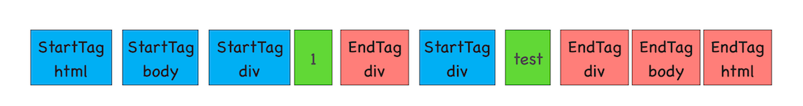 由图可以看出,Tag Token又分StartTag 和 EndTag,比如<body>就是StartTag ,</body>就是EndTag,分别对于图中的蓝色和红色块,文本Token对应的绿色块。
