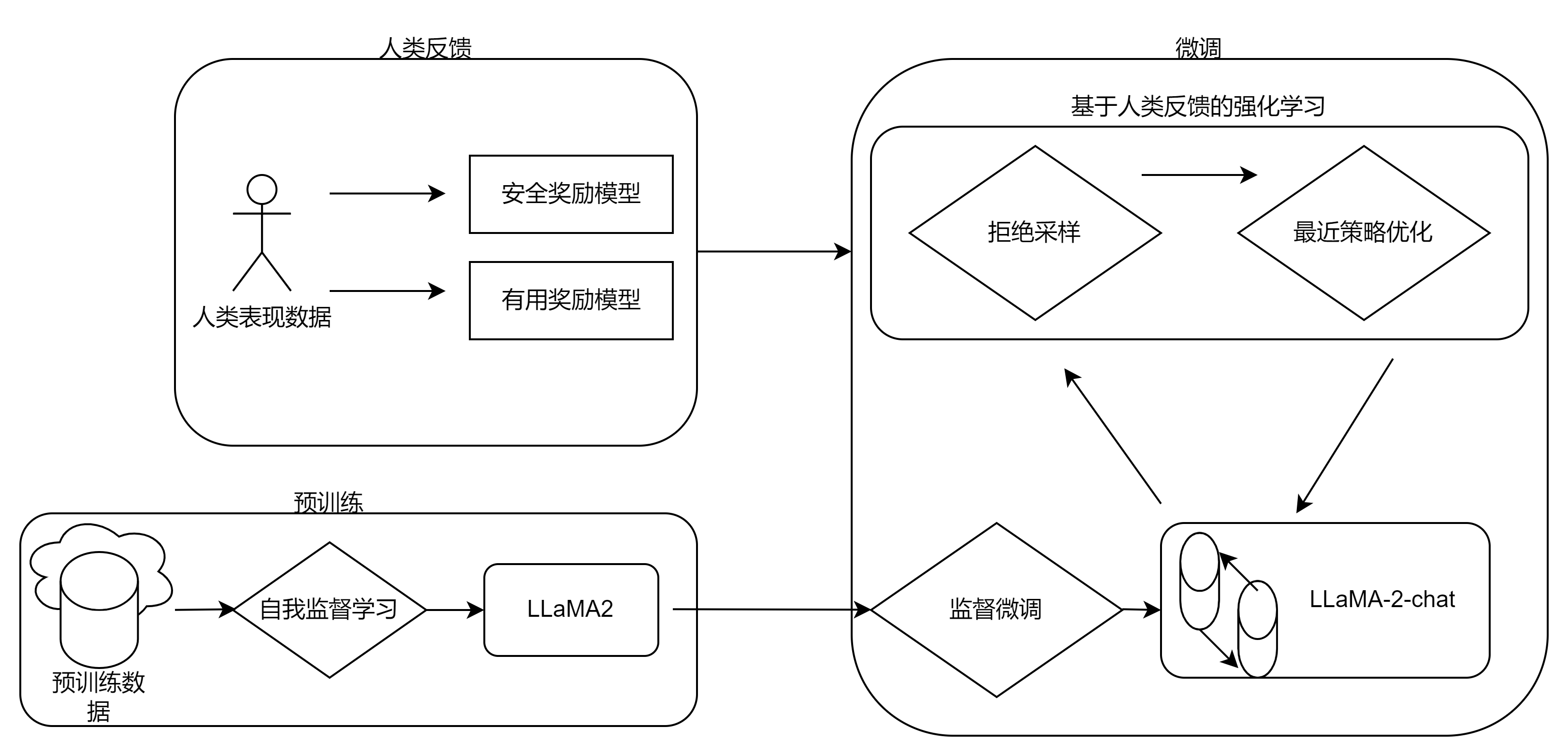 Llama 2是对Llama进行了更新的版本,可以理解为预训练版本。Llama 2-chat是针对对话场景优化过的Llama 2微调版本,理解为监督学习+强化学习后的微调版本。 下面按照大模型的预训练和微调,两大核心章节展开,总体模型训练框架图如下: