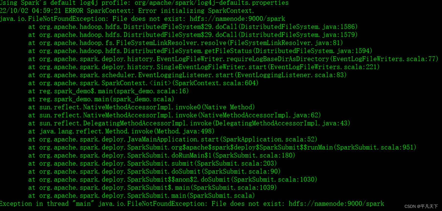 我第一次遇到这个问题,解决办法是在hdfs上建一个这样的spark文件夹,我的理解是我们运行任务肯定要有一个文件夹来保存每次的运行日志,当然也是我的自己理解,这样建完之后就可以执行了