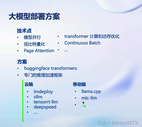 书生·浦语大模型实战营笔记-第五节 LMDeploy大模型量化部署实践 本文介绍大模型部署的背景知识,并介绍LMDeploy工具,并实现一个部署demoLLM在英伟达设备上的部署方案,包含模型轻量化、推理和服务推理性能:静态(固定batch和输出输入的token数目):小batch下性能是fp16的两倍,batch越大加速效果越不明显动态(输入输出不定长):精度优于vLLM框架本文主要介绍了模型量化和LMDeploy的基本应用,并实现了几个部署的demo。