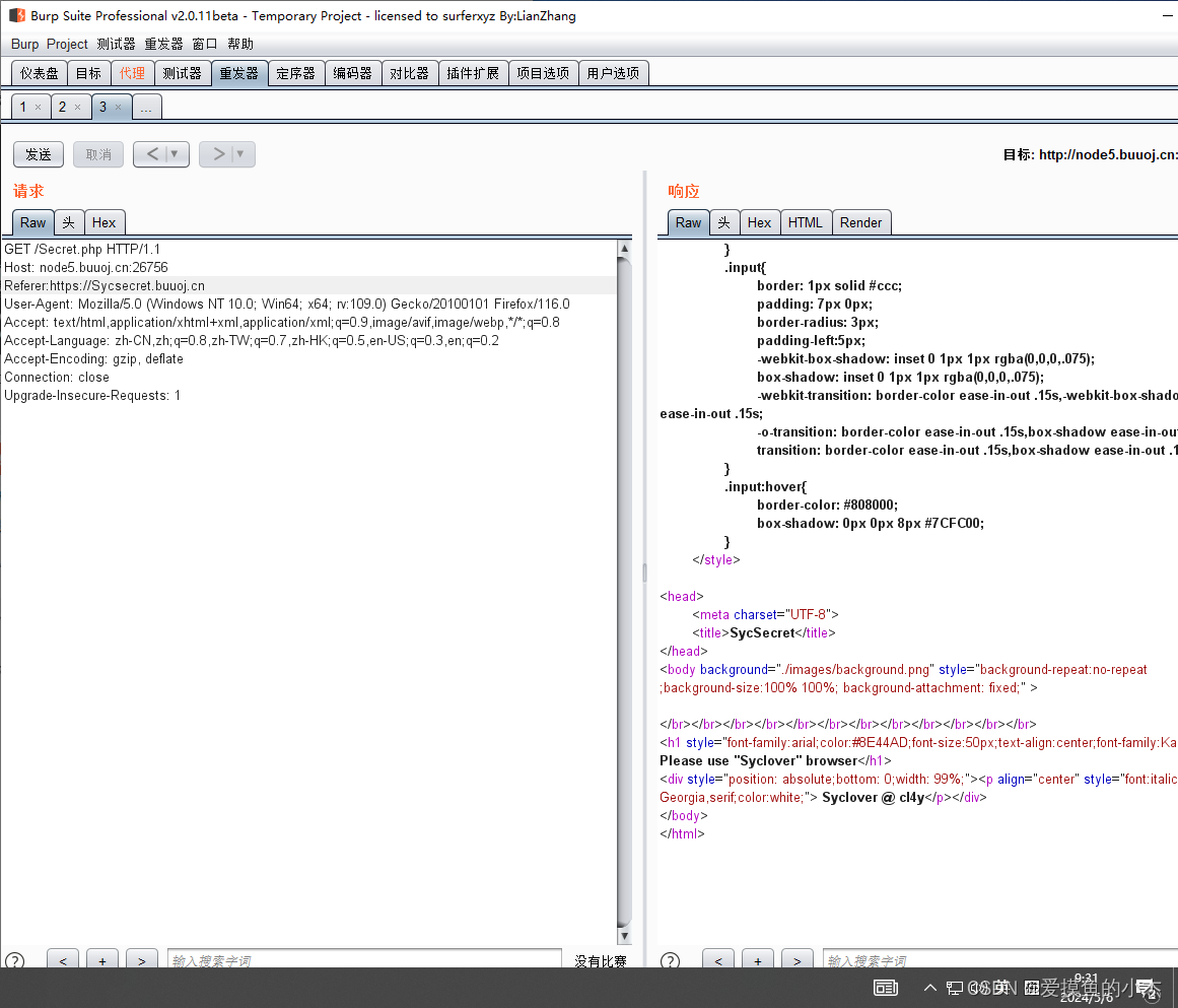 上面提示不是来自https://Sycsecret.com,就可以在header中添加上 Referer:https://Sycsecret.com ,来伪造访问来源,Referer协议就是告诉服务器我从哪里来。所以抓包修改。 下图是修改后的结果