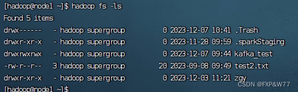 Hadoop学习笔记一 上述代码读取,则会提示文件路径不存在,提示如下:pyspark.errors.exceptions.captured.AnalysisException: [PATH_NOT_FOUND] Path does not exist: hdfs://node1:8020/kafka_test/kafka_csv.此时路径不存在的问题即可解决。这是因为hdfs文件的实际路径应为 /user/username/……例如本地端的实际文件路径应为 /user/hadoop/……