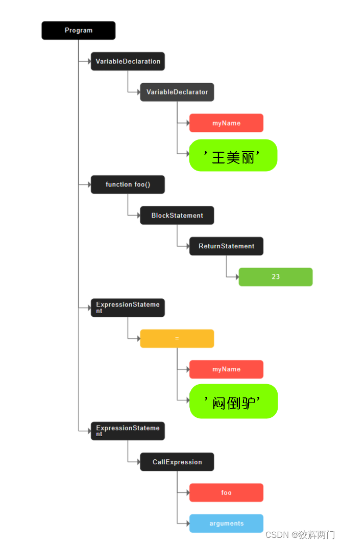 第二阶段是解析(parse),又称为语法分析,其作用是将上一步生成的 token 数据,根据语法规则转为 AST。如果源码符合语法规则,这一步就会顺利完成。但如果源码存在语法错误,这一步就会终止,并抛出一个“语法错误”。这就是 AST 的生成过程,先分词,再解析。