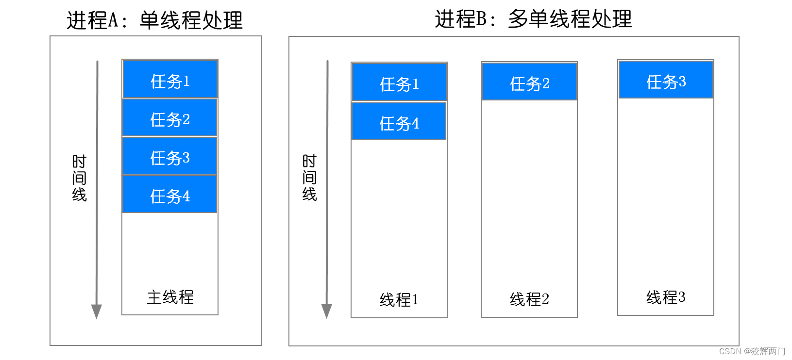 进程:一个进程就是一个程序的运行实例。详细解释就是,启动一个程序的时候,操作系统会为该程序创建一块内存,用来存放代码、运行中的数据和一个执行任务的主线程,我们把这样的一个运行环境叫进程。