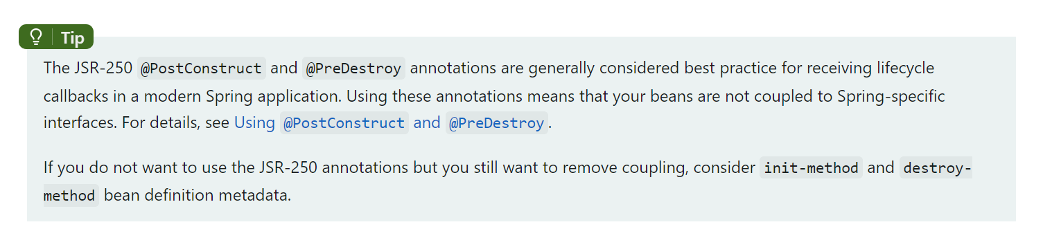 注解补充挑一些常用,但是深入不多的总结一下。Bean的生命周期在@Bean注解中,添加init属性和destroy属性@Bean(initMethod = "initMethod", destroyMethod = "destroyMethod")public User user() { return new User();}使用@PostContructor和@Pre...