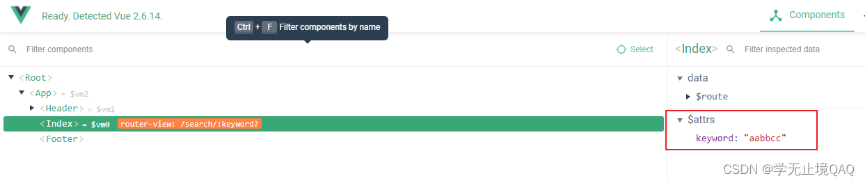 2. 打开项目页面的控制台,可以看到$route下keyword: 后面的数据会随着input输入内容的改变而改变编辑