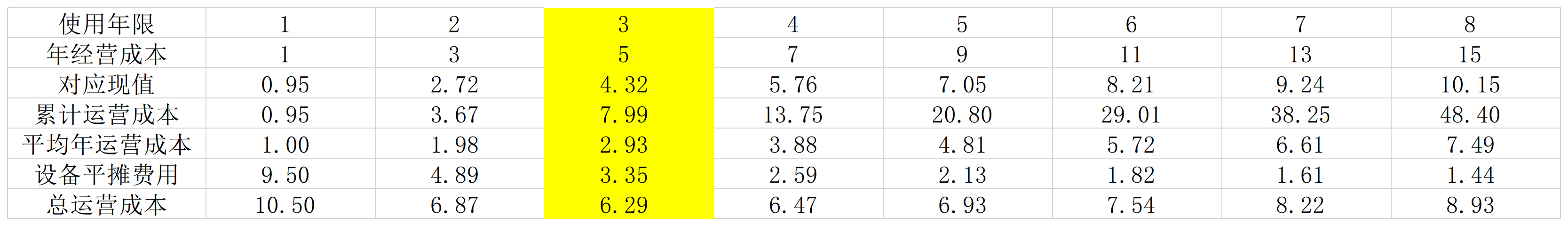正确答案: B:3年;使用年限 1 2 3 4 5 6 7 8 年经营成本 1 3 5 7 9 11 13 15 对应现值 0.95 2.72 4.32 5.76 7.05 8.21 9.24 10.15 累计运营成本 0.95 3.67 7.99 13.75 20.80 29.01 38.25 48.40 平均年运营成本 1.00 1.98 2.93 3.88 4.81 5.72 6.61 7.49 设备平摊费用 9.50 4.89 3.35 2.59 2.13 1.82 1.61 1.44 总运营成本 10.50 6.87 6.29 6.47 6.93 7.54 8.22 8.93 对应现值计算公式(Excel):